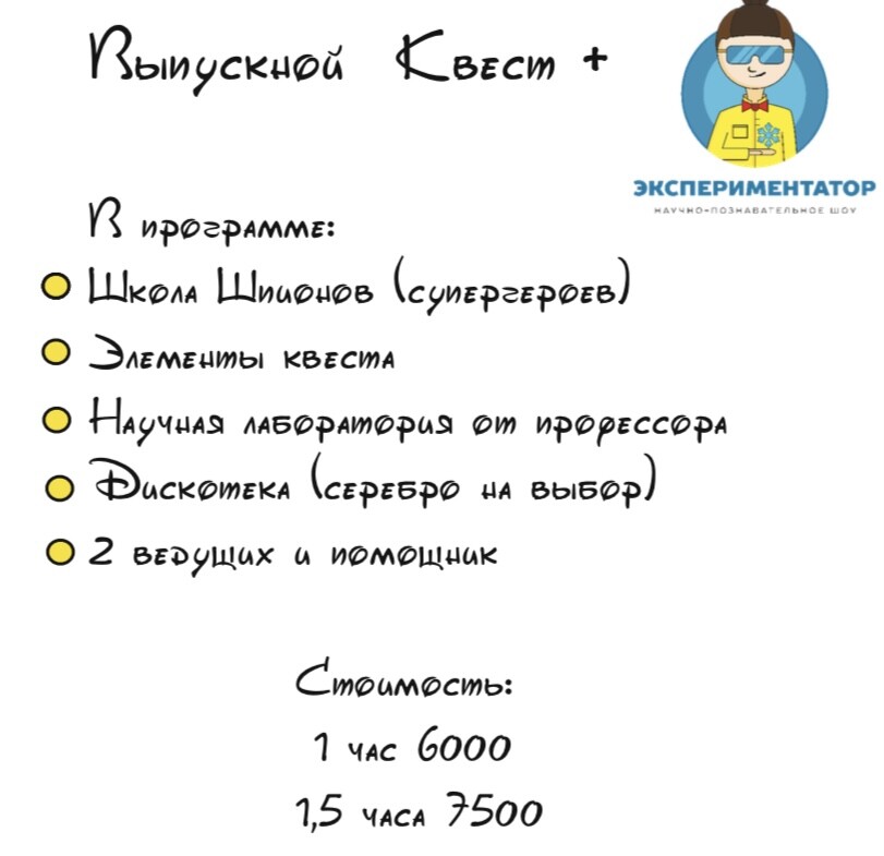 В программе 6-8 ярких опытов на выбор из 30-ти удивительных экспериментов, которые никого не оставят равнодушным. Такие опыты более зрелищные и требуют большего количества расходных материалов и оборудования.